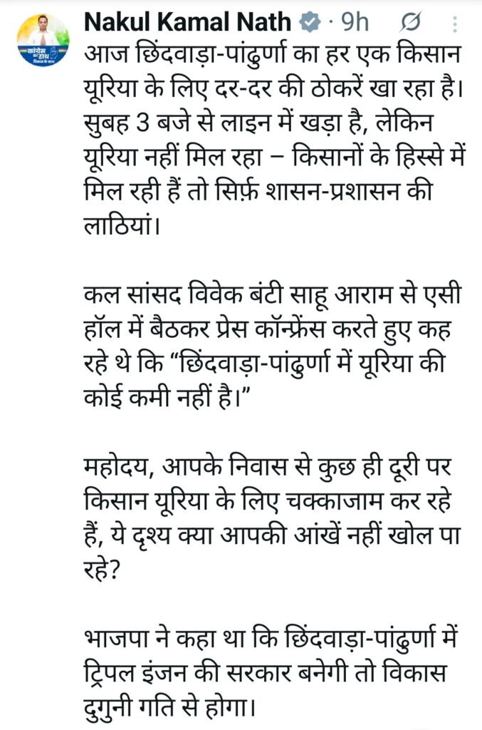पूर्व सांसद नकुलनाथ में यूरिया के लिए आंदोलन करने की बात कही…