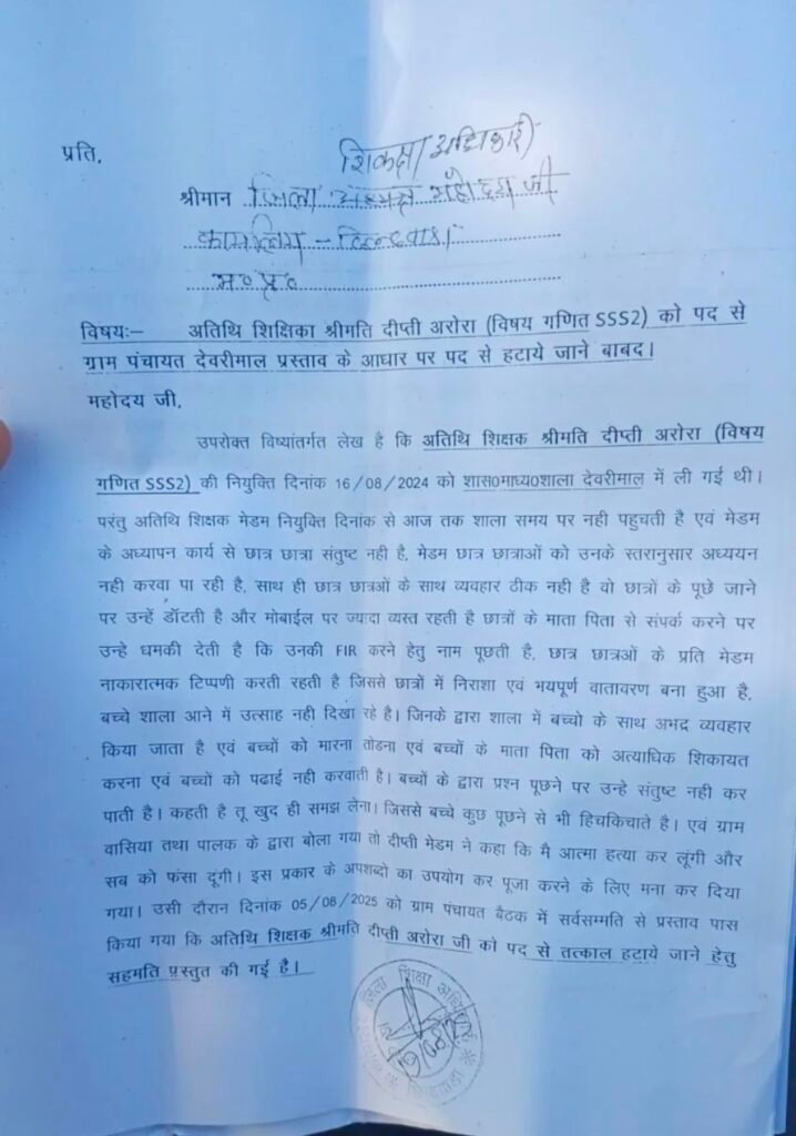 चौरई विकास खंड के देवरीमाल के ग्रामवासियों की चेतावनी दिया है कि यदि अतिथि शिक्षिका पर कार्रवाई नहीं हुई तो करेंगे आंदोलन..पूर्व सरपंच व भाजपा नगर मंडल महामंत्री राजेंद्र संदर्भ ने बताया कि यह मामला तीन वर्षों से लंबित है और अब यह पूरे गांव के लिए गंभीर चिंता का विषय बन चुका है। यदि शिक्षा विभाग ने शीघ्र कार्रवाई नहीं की तो ग्रामवासी उग्र आंदोलन करेंगे।