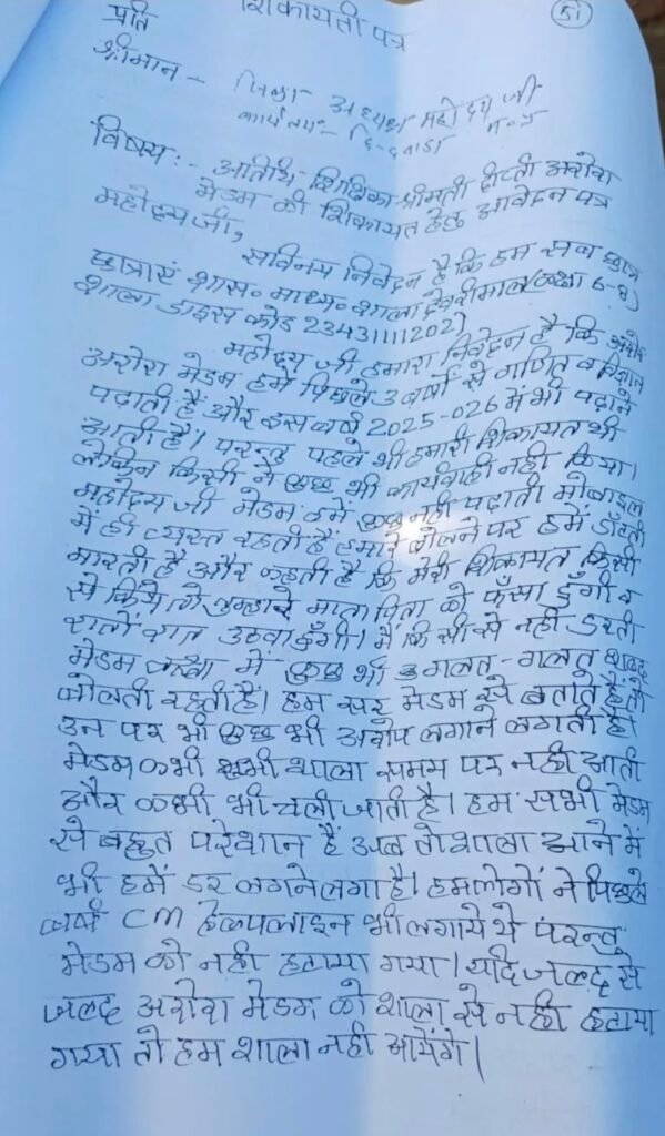 छात्र-छात्राओं ने लिखित आवेदन में बताया कि शिक्षिका पढ़ाई में रुचि नहीं लेतीं और पूरा समय मोबाइल पर बिताती हैं। डाउट पूछने पर फटकार लगाती हैं और कई बार आत्महत्या करने की धमकी भी देती हैं, जिससे बच्चे मानसिक रूप से भयभीत हैं।
