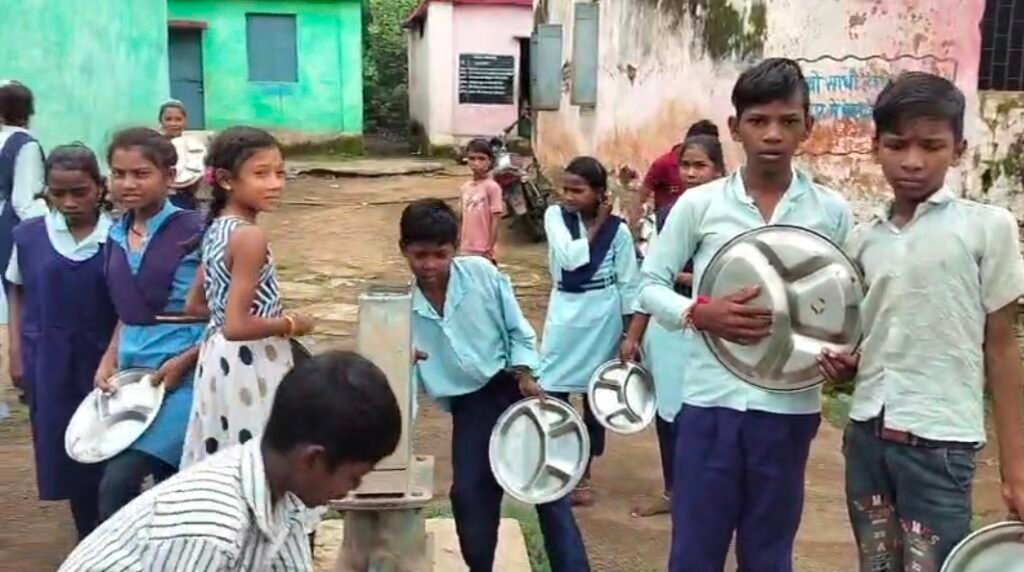 हैंड पंप पर लाइन लगाकर बर्तन लेकर खड़े हुए बच्चे, धोने लगे प्लेट- गिलास….