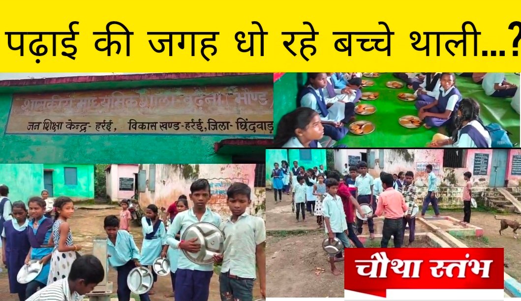 जंहा सरकार बच्चों को अच्छी शिक्षा मिल सके इसके लिए सरकार ने बच्चों को आकर्षित करने के लिए मिड डे मील जैसी योजना संचालित की है लेकिन छिंदवाड़ा जिलें के हर्रई में इसका उल्टा देखने को मिला रहा है.. वीडियो में दिख रहा है कि मध्याह भोजन के बाद छोटे छोटे बच्चों पढाई छोड़ बर्तन धो रहे हैं, सभी बच्चों अपनी थालियां लेकर सरकारी नल पर कतार में खडे है, वे एक एक करके अपने बर्तन धो रहे हैं यह दृश्य किसी स्कूल की बजाय ढाबे या होटल जैसा लग रहा है…