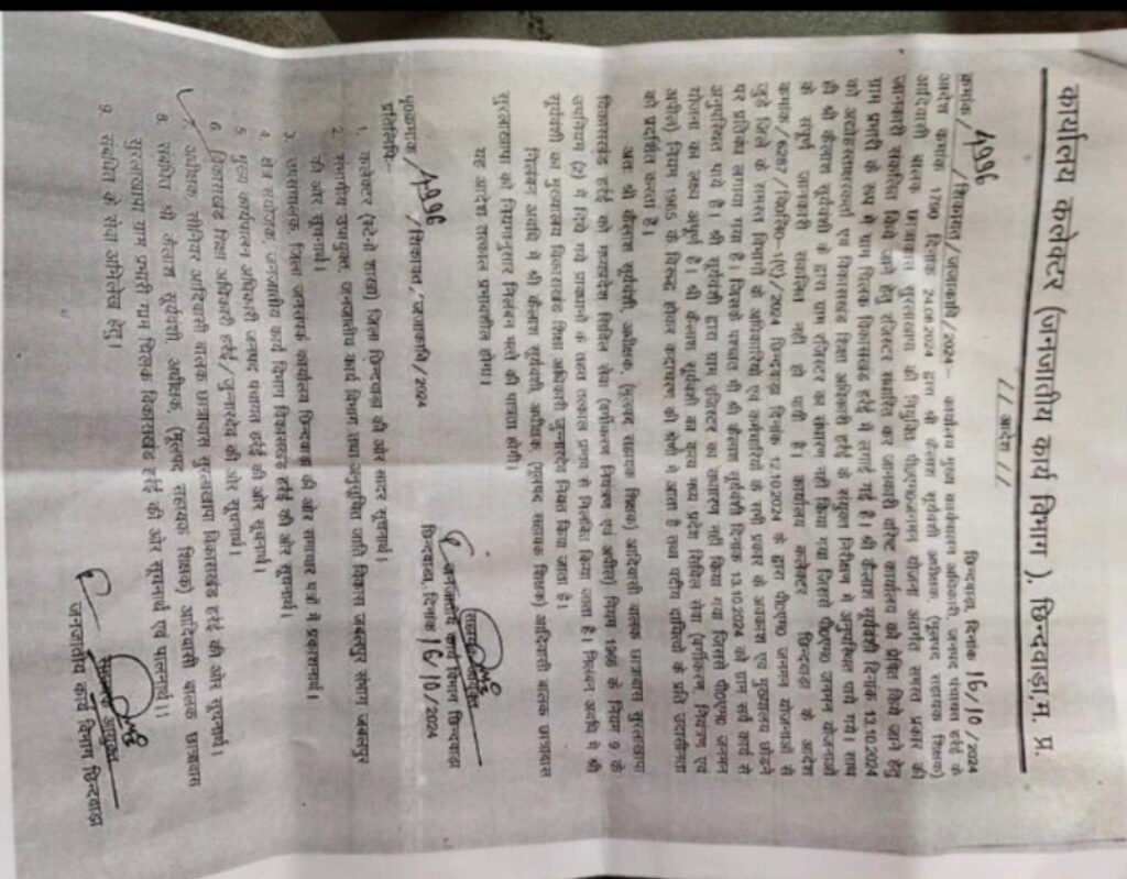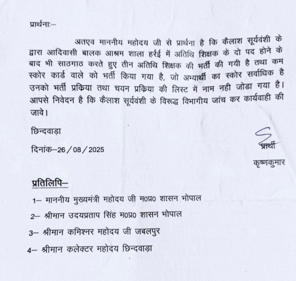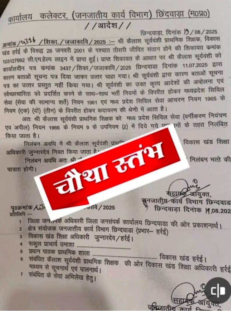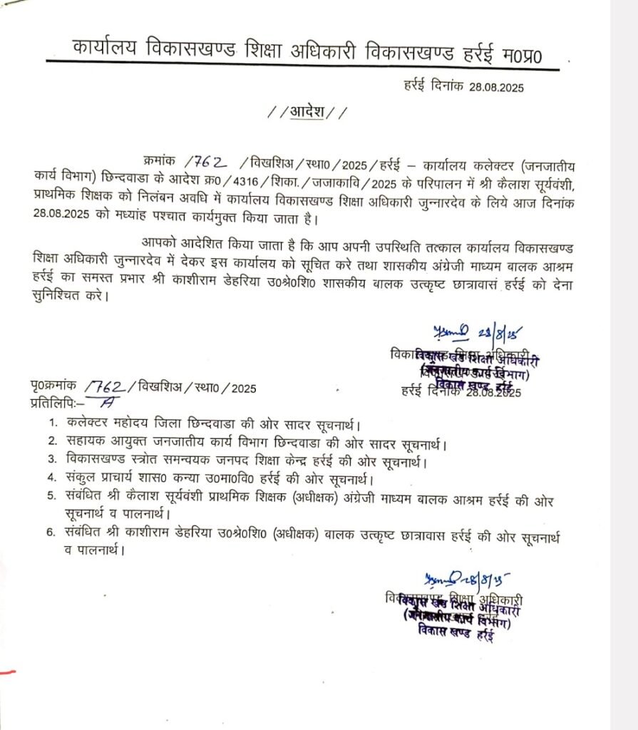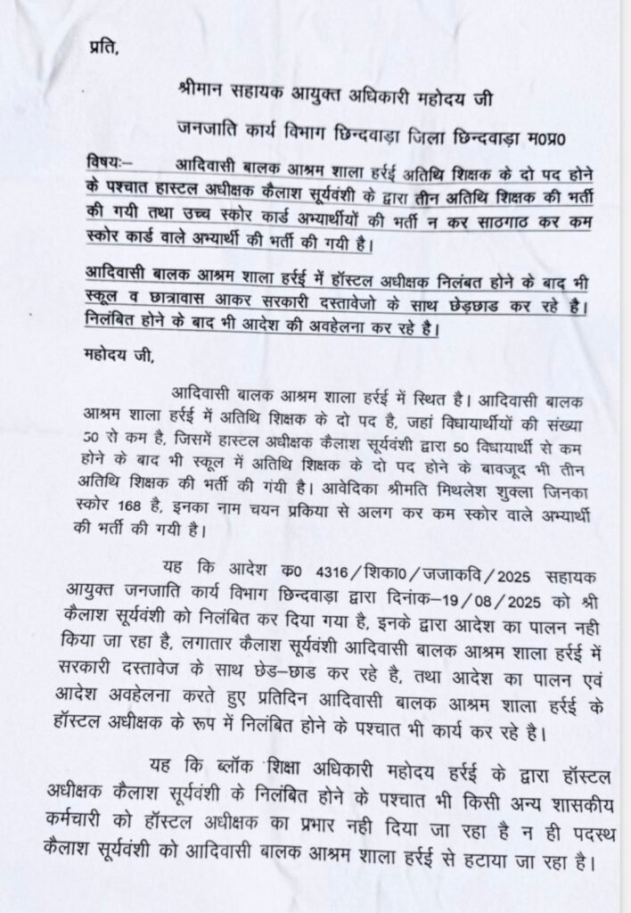 यह कि आदेश क0 4316/शिका०/जजाकवि/2025 सहायक आयुक्त जनजाति कार्य विभाग छिन्दवाड़ा द्वारा दिनांक-19/08/2025 को श्री कैलाश सूर्यवंशी को निलंबित कर दिया गया है, इनके द्वारा आदेश का पालन नही किया जा रहा है, लगातार कैलाश सूर्यवंशी आदिवासी बालक आश्रम शाला हर्रई में सरकारी दस्तावेज के साथ छेडछाड कर रहे है, तथा आदेश का पालन एवं आदेश अवहेलना करते हुए प्रतिदिन आदिवासी बालक आश्रम शाला हर्रई के हॉस्टल अधीक्षक के रूप में निलंबित होने के पश्चात भी कार्य कर रहे है।