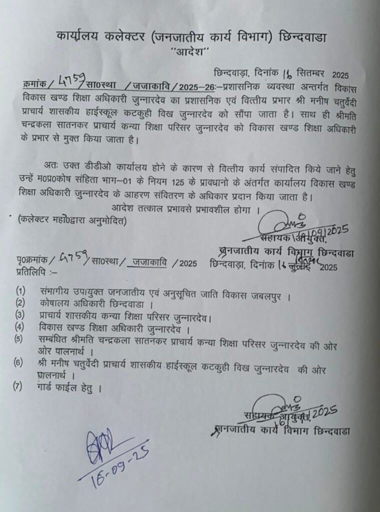 कलेक्टर (जनजातीय कार्य विभाग) कार्यालय छिंदवाड़ा द्वारा जारी आदेश के अनुसार विकास खंड शिक्षा अधिकारी जुन्नारदेव का प्रशासनिक एवं वित्तीय प्रभार अब मनीष चतुर्वेदी, प्राचार्य शासकीय हाईस्कूल कटकुही, को सौंपा गया है।इसके साथ ही चन्द्रकला सातनकर, प्राचार्य कन्या शिक्षा परिसर जुन्नारदेव, को विकास खंड शिक्षा अधिकारी के प्रभार से मुक्त कर दिया गया है।नए आदेश के तहत मनीष चतुर्वेदी को वित्तीय कार्यों के संचालन हेतु मध्यप्रदेश कोष संहिता भाग-01 के नियम 125 के अंतर्गत आहरण एवं संवितरण अधिकारी (DDO) के अधिकार भी प्रदान किए गए हैं।यह आदेश तत्काल प्रभाव से लागू कर दिया गया है।