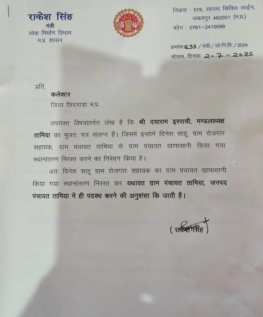दरअसल प्रभारी मंत्री राकेश सिंह छिंदवाड़ा प्रवास पर ये इस दौरान उनके समक्ष रोजगार सहायक दिनेश साहू की शिकायत पहुंची इस शिकायत के दौरान प्रभारी मंत्री के आदेश पर ट्रांसफर रुकवाने की बात भी सामने आई प्रभारी मंत्री राकेश सिंह ने जैसे ही लेटर पेड में अपने फर्जी हस्ताक्षर देखे उन्होंने इस फर्जी आदेश को लेकर प्रशासनिक अधिकारियों पर कड़ी नाराजगी जाहिर की तथा इस मामले में दोषी लोगों के खिलाफ एफआईआर दर्ज कराने के निर्देश दिए है