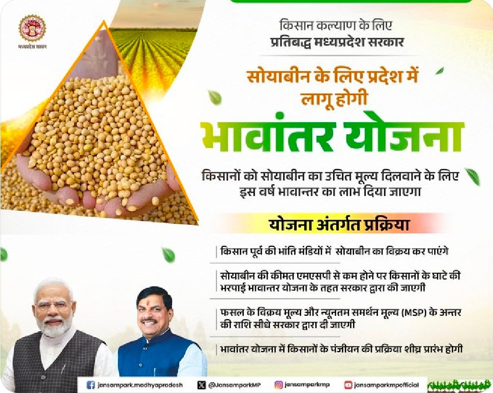भोपाल (चौथा स्तंभ) मुख्यमंत्री डॉ. मोहन यादव ने कहा है कि प्रदेश में सोयाबीन उत्पादक किसानों के हित में प्रारंभ की जा रही भावांतर योजना को लागू करने के लिए जिला स्तर पर प्रशासनिक अमले को दायित्व दिए जाएं। इस योजना की विशेषताओं को प्रत्येक स्तर पर प्रचारित किया जाए, जिससे अधिक से अधिक किसानों को इसका लाभ मिले। सांसद, विधायक एवं अन्य जनप्रतिनिधि योजना के प्रचार-प्रसार के लिए सोशल मीडिया प्लेटफार्म का भी उपयोग करें। प्रधानमंत्री श्री नरेन्द्र मोदी ने अन्नदाताओं की चिंता कर सोयाबीन को निर्धारित न्यूनतम समर्थन मूलय 5328 रूपए प्रति क्विंटल निर्धारित की है। मध्यप्रदेश सरकार किसानों को उनके उत्पादन का मूल्य दिलवाने के लिए प्रतिबद्ध है। जिस तरह धान और गेहूं पर किसानों को उनके परिश्रम की कीमत दिलवाने का कार्य किया गया है, उसी तरह सोयाबीन उत्पादक किसानों को भी लाभ दिलवाया जाएगा।