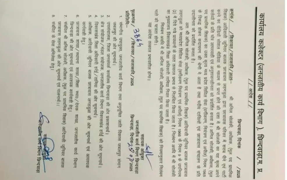 छिंदवाड़ा जिले में जनजाति कर विभाग के सहायक आयुक्त की उदासीनता के कारण जिले के आश्रम शाला एवं छात्रावासों में दर्जनों घटनाएं हो चुकी हैं उसके बाद भी लगता है सहायक आयुक्त की आंख नहीं खुल रही है इसलिए तो जहां पहले से ही जी छात्रावास में एक आदिवासी बालक की छात्रावास अधीक्षक की लापरवाही से एक मौत हो चुकी है उसके बाद भी एक शराबी अधीक्षक जो कभी भी मुख्यालय में नहीं रहता और चौरई से आना-जाना करता है उसको बालक आश्रम सोनपुर का अधीक्षक बना दिया गया है, इसलिए यह कहना गलत नहीं होगा की जनजाति कर विभाग में अंधेर नगरी चौपट राजा टका शेर भाजी टका शेर खा जा वाली कहानी चल रही है,…