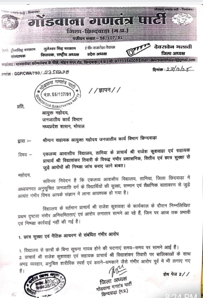 जिलें के सबसे बडे आवासीय एकलव्य विधालय तामिया एक बार फिर सुर्खियों में है, क्योंकि इस बार ये सब आरोप गोंडवाना गणतंत्र पार्टी के जिला अध्यक्ष देव रमन भलावी ने लगाया है। उनका कहना है कि इन दिनों आदिवासी समाज के बच्चों के साथ अन्याय एवं अत्याचार हो रहा है, ऐसी कई अनियमितताओं के गंभीर आरोप लगाये गयें है,गोंडवाना गणतंत्र पार्टी के जिला अध्यक्ष के नेतृत्व में आज एक विस्तृत ज्ञापन आयुक्त, जनजातीय कार्य विभाग भोपाल एंव सहायक आयुक्त जनजाति विभाग छिंदवाड़ा को सौपा गया है यह ज्ञापन आयुक्त जनजाति कार्य विभाग भोपाल के नाम संबोधित किया गया है। क्योंकि एकलव्य आवासीय विद्यालय, तामिया में अध्ययनरत अनुसूचित जनजाति वर्ग के छात्र–छात्राओं की सुरक्षा, सम्मान और शैक्षणिक भविष्य से जुड़े गंभीर मामलों को लेकर आज गोंडवाना गणतंत्र पार्टी द्वारा सख्त कदम उठाया गया।ज्ञापन में एकलव्य आवासीय विद्यालय, तामिया के