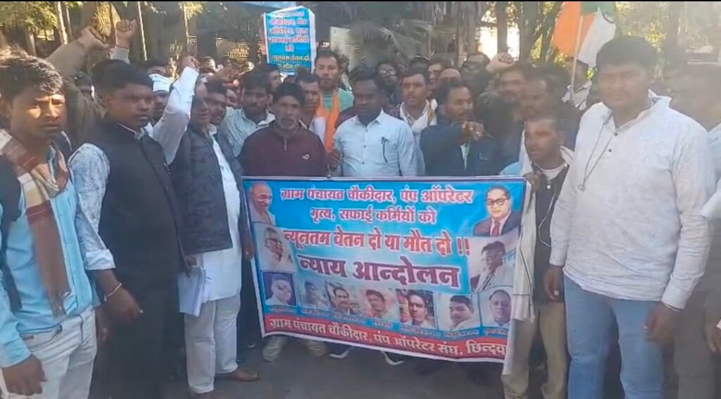 छिंदवाड़ा (चौथा स्तंभ) जिलें में इन दिनों आउटसोर्स, अस्थाई, अंशकालीन, ग्राम पंचायत कर्मचारी आपनी वेतन वृद्धि के लेकर आंदोलन कर रहे है, आज आउटसोर्स, अस्थाई, अंशकालीन, ग्राम पंचायत कर्मचारी संयुक्त मोर्चा, ने जिला पंचायत के समाने रैली निकलकर कार्यालय के सामने धरना दिया एवं अपनी मांगों को लेकर अड़े रहे बाद में जिला पंचायत सीईओ की समझाइए के बाद उन्होंने अपना धरना समाप्त किया, क्योंकि आज प्रदेश की समस्त ग्राम पंचायतों में पंचायत राज संचालनालय, मध्य प्रदेश के आदेश क्रमांकः पं.पं. परा-2013-13700 दिनांक 10-12-2013 के तहत ग्राम सभाओं के अनुमोदन के बाद चतुर्थ श्रेणी अंशकालीन, नल जल चालक, भृत्य, सफाई कर्मचारियों की नियुक्ति ग्राम सभाओं के प्रस्ताव के जरिए पंच परमेश्वर योजना के तहत की गई थी और पंच परमेश्वर योजना की मद से वेतन का भुगतान किया जाता था।