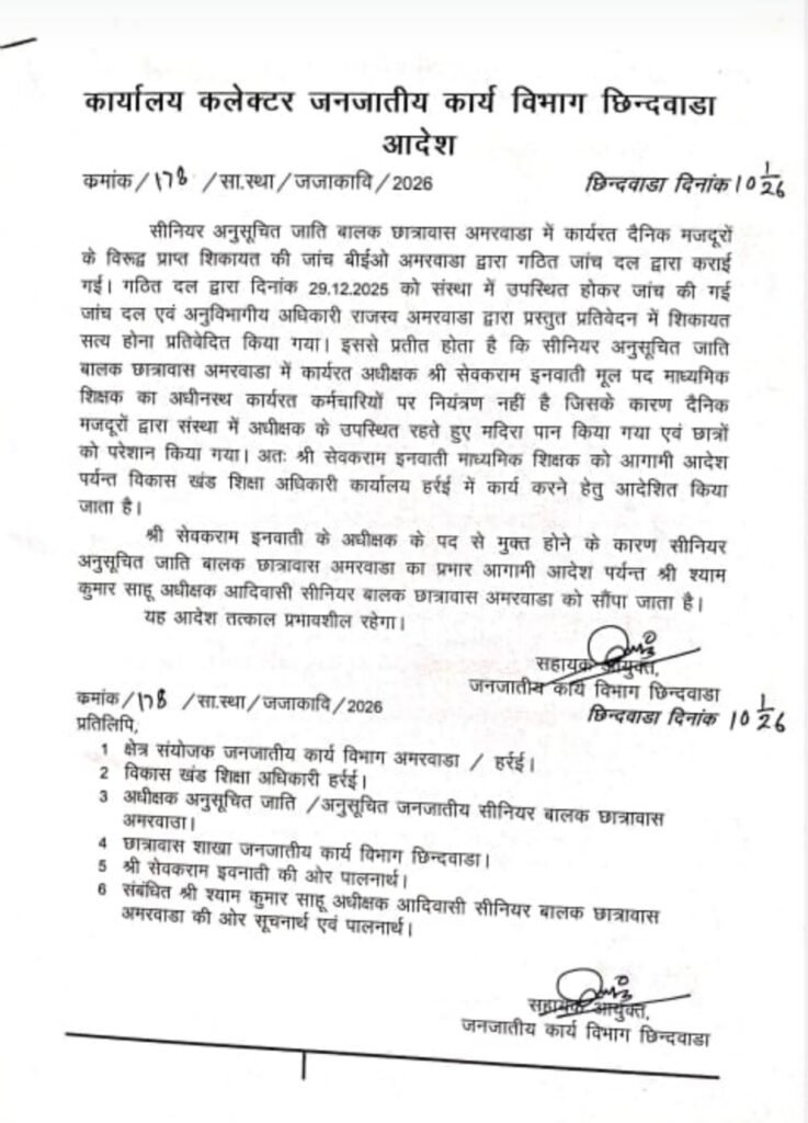 सीनियर अनुसूचित जाति बालक छात्रावास अमरवाडा में कार्यरत दैनिक मजदूरों के विरूद्ध प्राप्त शिकायत की जांच बीईओ अमरवाडा द्वारा गठित जांच दल द्वारा कराई गई। गठित दल द्वारा दिनांक 29.12.2025 को संस्था में उपस्थित होकर जांच की गई जांच दल एवं अनुविभागीय अधिकारी राजस्व अमरवाडा द्वारा प्रस्तुत प्रतिवेदन में शिकायत सत्य होना प्रतिवेदित किया गया। इससे प्रतीत होता है कि सीनियर अनुसूचित जाति बालक छात्रावास अमरवाडा में कार्यरत अधीक्षक श्री सेवकराम इनवाती मूल पद माध्यमिक शिक्षक का अधीनस्थ कार्यरत कर्मचारियों पर नियंत्रण नहीं है जिसके कारण दैनिक मजदूरों द्वारा संस्था में अधीक्षक के उपस्थित रहते हुए मदिरा पान किया गया एवं छात्रों को परेशान किया गया। अतः श्री सेवकराम इनवाती माध्यमिक शिक्षक को आगामी आदेश पर्यन्त विकास खंड शिक्षा अधिकारी कार्यालय हर्रई में कार्य करने हेतु आदेशित किया जाता है।