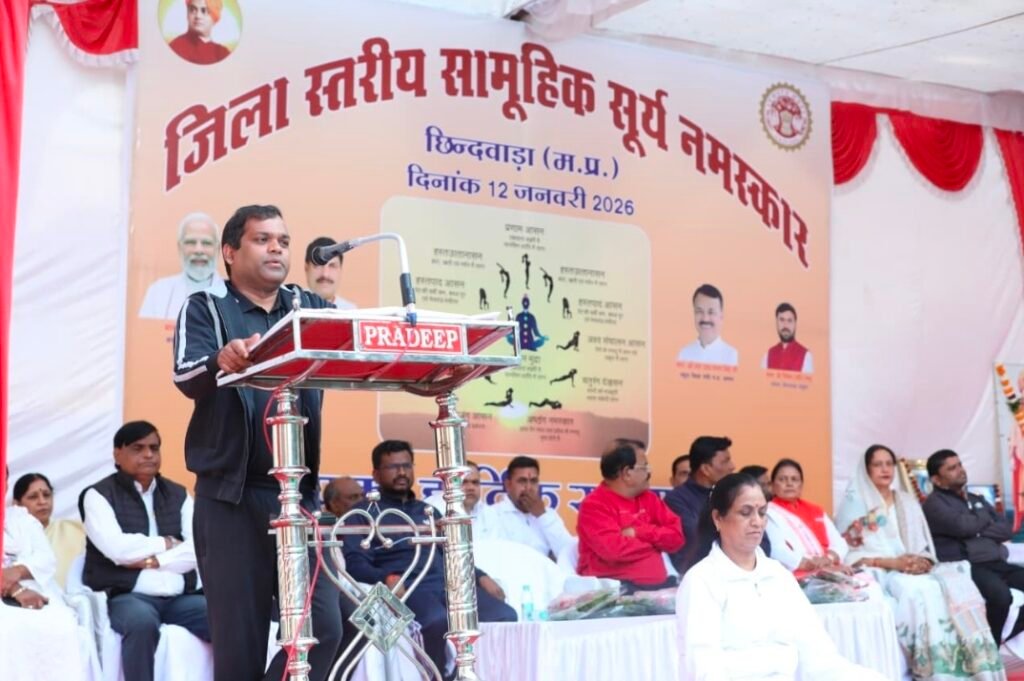 छिन्दवाड़ा(चौथा स्तंभ) स्वामी विवेकानंद जी के जन्मदिवस पर 12 जनवरी को जिलेभर में सामूहिक सूर्य नमस्कार का आयोजन किया गया। जिला प्रशासन एवं स्कूल शिक्षा विभाग द्वारा जिला स्तरीय सामूहिक सूर्य नमस्कार कार्यक्रम का आयोजन पीएम श्री एमएलबी स्कूल प्रांगण में किया गया। राष्ट्रीय युवा दिवस के अवसर पर आयोजित इस गरिमामय कार्यक्रम में कलेक्टर श्री हरेंद्र नारायन, नगरपालिक निगम छिंदवाड़ा के महापौर श्री विक्रम अहके, श्री शेषराव यादव, श्री विजय पांडे सहित अन्य जनप्रतिनिधि,