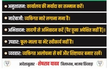 भाजपा कार्यालय में अनुशासन, नारेबाजी, अभिनंदन, उपहार और व्यवहार को लेकर गाईड लाईन जारी की गई है। जिसका कार्यालय में सभी संगठन के पदाधिकारी, जनप्रतिनिधि और कार्यकर्ताओं को पालन करना होगा। इसमें कार्यालय की मर्यादा का सम्मान करने, व्यक्ति गत नारेबाजी पर प्रतिबंध, सादगी से अभिवादन करने और पैर छूने पर रोक, फूल माला या भेंट स्वीकार्य पर पाबंदी और व्यक्ति गत आलोचना से बचने तथा शिष्टाचार बनाए रखने का पोस्टर कार्यालय में चस्पा किया गया है।