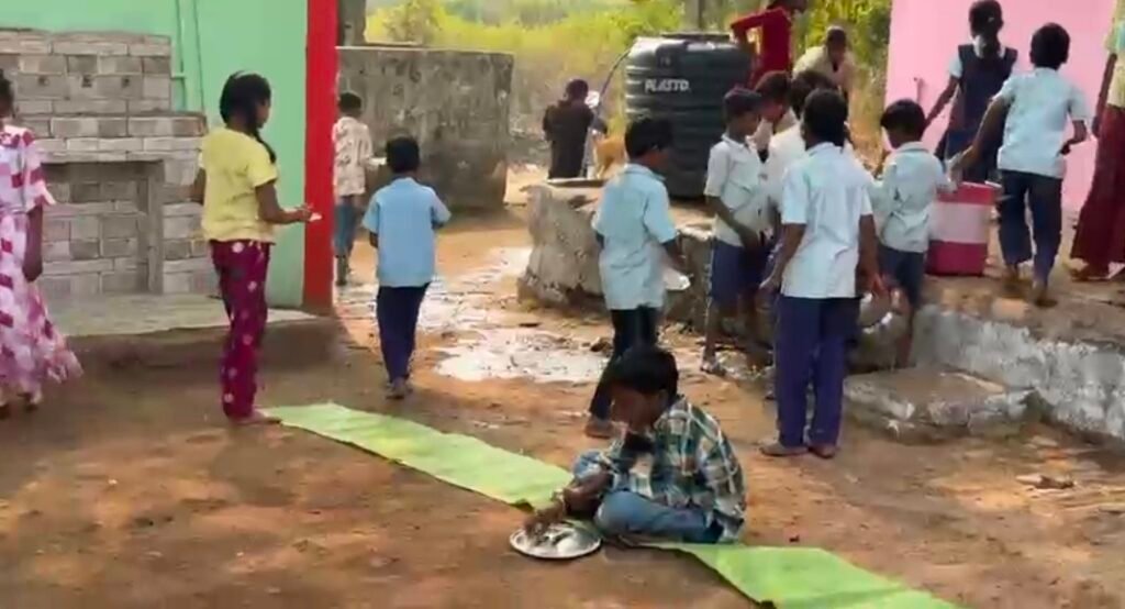 स्कूल ग्राउंड में बैठाकर खिलाते हैं बच्चों को मिड डे मील….