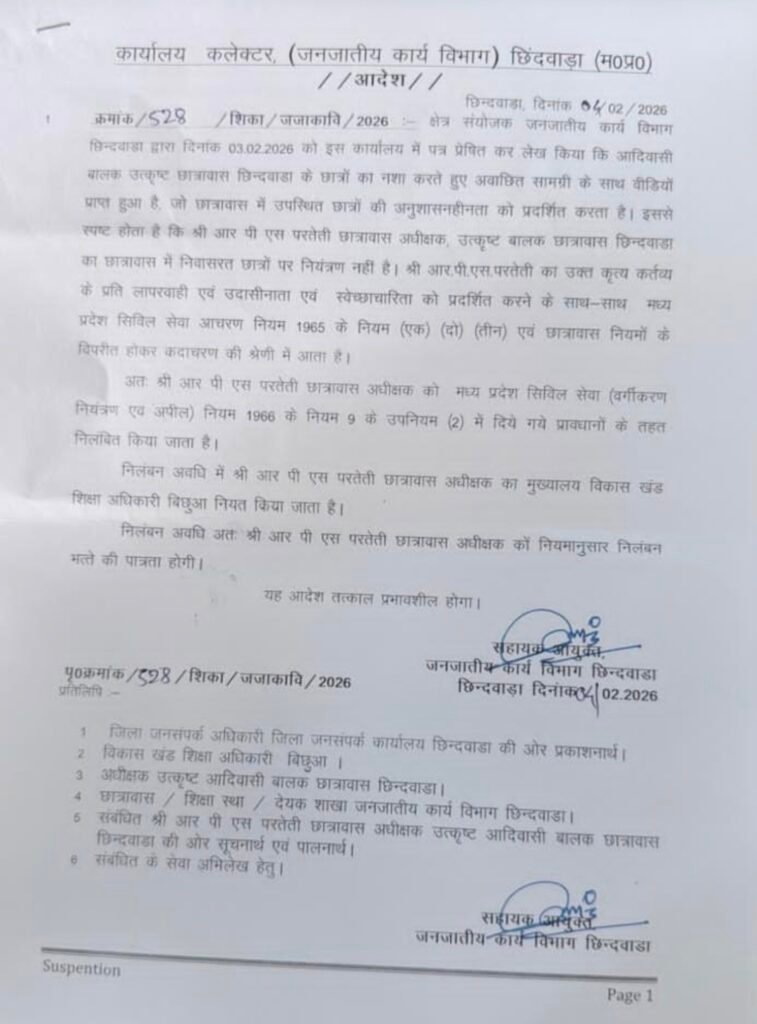 मामले को गंभीर लापरवाही मानते हुए सहायक आयुक्त जनजाति विभाग ने छात्रावास के अधीक्षक को निलंबित कर दिया है। आदेश में स्पष्ट किया गया है कि छात्रावास में रह रहे छात्रों की सुरक्षा, अनुशासन और देखरेख की जिम्मेदारी अधीक्षक की होती है, लेकिन इस मामले में घोर लापरवाही सामने आई है।