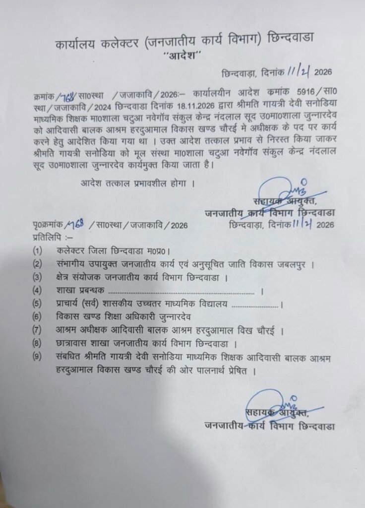 गौरतलब है कि आयुक्त जनजातीय कार्य द्वारा स्पष्ट निर्देश जारी किए गए थे कि परिवीक्षा अवधि के दौरान किसी भी शिक्षक का तबादला या अटैचमेंट नियम विरुद्ध है और ऐसे आदेश स्वतः निरस्त माने जाएंगे। इसके बावजूद जुन्नारदेव विकासखंड में पदस्थ शिक्षिका गायत्री देवी सनोडिया को चौरई विकासखंड के हरदुआ माल स्थित आदिवासी बालक आश्रम में अधीक्षक के रूप में अटैच किया गया था, जिस पर सवाल उठे थे।