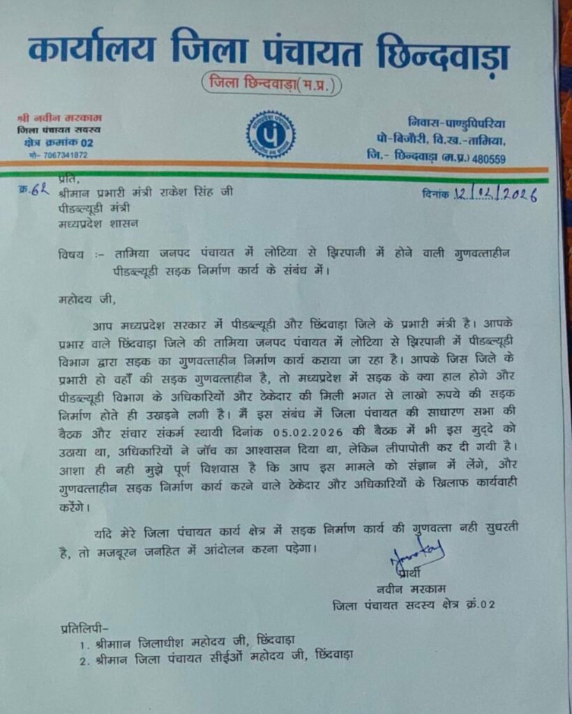 मामले को लेकर शिकायतकर्ता ने सीधे मध्यप्रदेश सरकार में पीडब्ल्यूडी और जिले के प्रभारी मंत्री से हस्तक्षेप की मांग की है। शिकायत में कहा गया है कि जिस जिले के प्रभारी मंत्री स्वयं हैं, वहीं यदि सड़क निर्माण की यह स्थिति है, तो पूरे प्रदेश में निर्माण कार्यों की गुणवत्ता पर सवाल उठना लाजिमी है। आरोप है कि पीडब्ल्यूडी विभाग के अधिकारियों और ठेकेदार की मिलीभगत से लाखों रुपये की लागत से बन रही सड़क में गंभीर अनियमितताएं हो रही हैं।