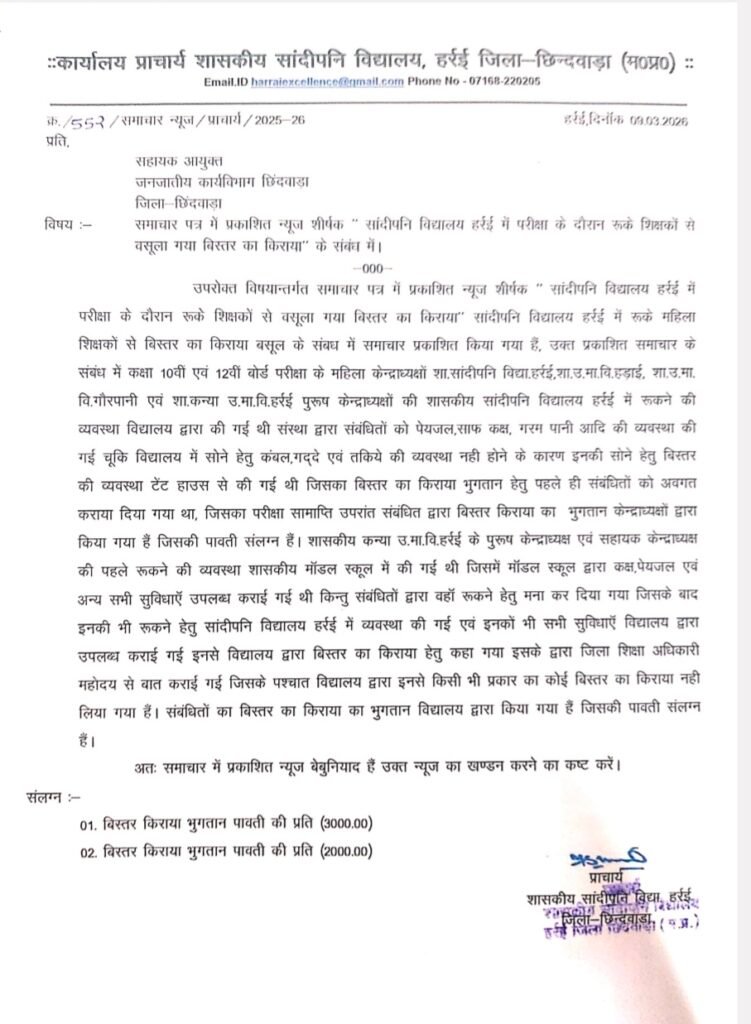 छिंदवाड़ा (चौथा स्तंभ )हर्रई के संदीपनी विद्यालय के बिषय में समाचार पत्रों में प्रकाशित खबर “सांदीपनि विद्यालय हर्रई में परीक्षा के दौरान रूके शिक्षकों से बिस्तर का किराया वसूला गया” को लेकर संस्था की ओर से सख्त आपत्ति दर्ज कराते हुए इसे पूरी तरह भ्रामक, तथ्यों से परे और बेबुनियाद बताया गया है।